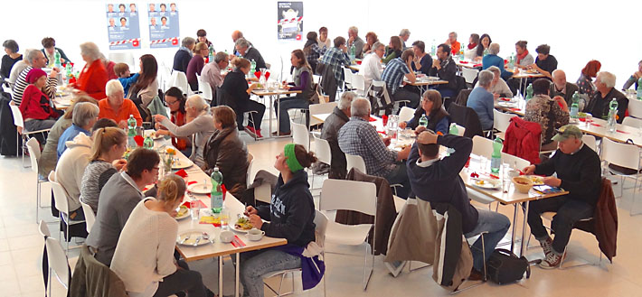 Mit kurzer Verspätung wurde dann das von Hanspeter Göldi mit Küchenteam fertiggestellte Mittagsbuffet eröffnet. Nach Pizzastückchen zum Apéro gab es diverse Salate, eine Fleisch- und Käseplatte mit Melone, Spargelrisotto, Gemüselasagne, Hühner- und Gemüsesuppe mit Würstchen, Raclettkartoffeln und sogar eine Portion Kutteln für Feinschmecker. Zum Dessert lockte Fruchtsalat, Beerencrème, Schwarzwälder Torte und diverse Patisserie.